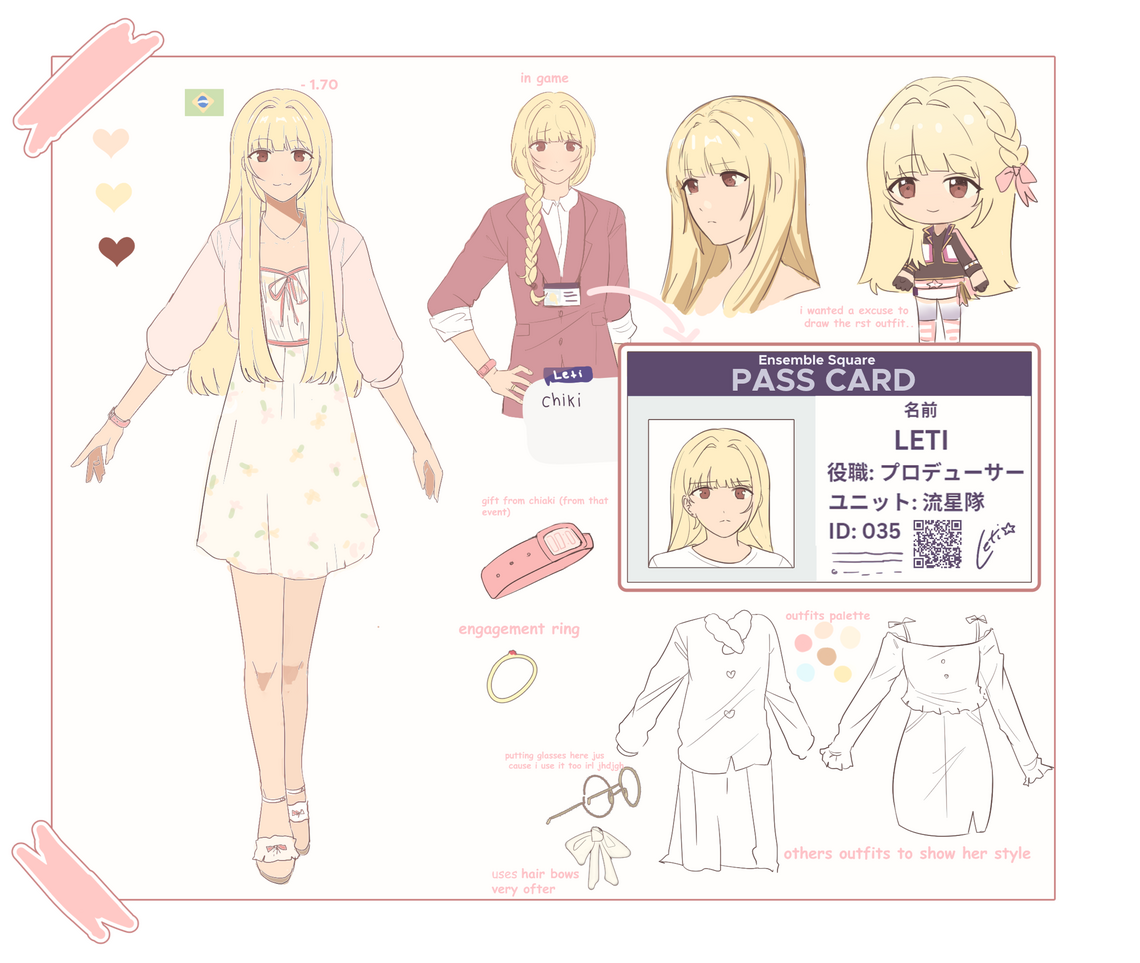 In terms of lore, Leti is mostly just Ryuseitai's producer, but since she's Chiaki’s wife and a big fan of tokusatsu, this dynamic is really special to me. It’s one of the main points of my yume and I like to think that it’s kind of 'canon' in Chiaki’s mind that Leti is the Ryusei Pink of Ryuseitai and that she fits perfectly into that ''role''.